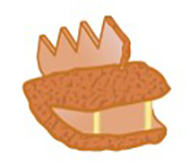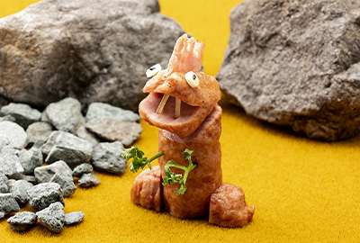 ストローでくり抜いたスライスチーズ2個に黒ごまをつけて目をつけ、怪獣の胸の部分にパセリの茎を差して手をつければ出来上がり。