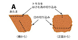 Aの正面に口になる切り込みを入れ、その上にトサカをはさむ為の切り込みを入れます。