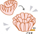 切れ目を上にしてハムを巻き、下の部分をパスタでとめます。