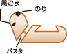 頭と体をパスタでとめ、黒ごまで目を、のりで鼻をつけます。
