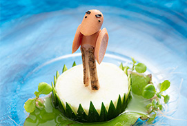 煮ゴボウ(足)を横2mm縦2cmに2本切り、D(胴体)に差し込み、土台の大根に差し込み出来上がり。
