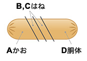 ウインナー全体の1/3のところから斜めにカットします。A(かお)と平行に1mm幅で、はね(B、C)を切ります。
