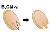 はね(B、C)を図のように山型に切り、D(胴体)の両側にパスタで付けます。