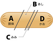 ウインナーを斜め4つに切り分けます。胴体(A)、あし(B)、C(みみ)、D(かお)