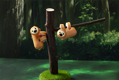 ナマケモノは今日も木につかまって、のんびり、まったり。手と足は、スライスしたウインナーをストローでくり抜いて作ります。