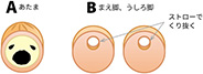Aの断面にストローでくり抜いたスライスチーズを貼って、その上に丸く切った焼きのりの鼻と黒ごまの目をつけます。さらにBはストローでくり抜いて手と足にします。