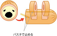 1のCに5mm幅でウインナーの半分まで4回切り込みを入れ、図のように2か所を切り取り、そこにBをはめ込んで、BC一緒にパスタでとめます。