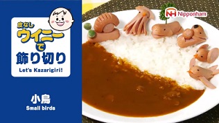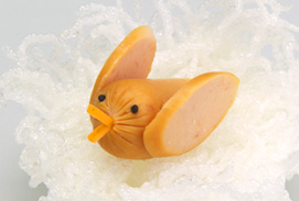 加熱したウインナーを絵のように切り、羽を2枚作ります。