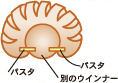 別のウインナーから切り取った約1cm幅の輪切りを軸に1を巻きつけて、両端をパスタでとめて固定します。