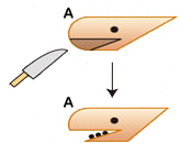胴体(B)をタテにV字の溝を入れ、切り取った(C)は尻尾になります。