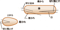 加熱したウインナーを図のように体と尾ひれに切り分け、口部分を作り、切り込みを入れます。
