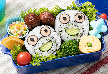 丸く抜いたにんじんを鼻の位置にのせて、スパゲティで固定する。のりで作った目にうすくマヨネーズを塗ってつける。