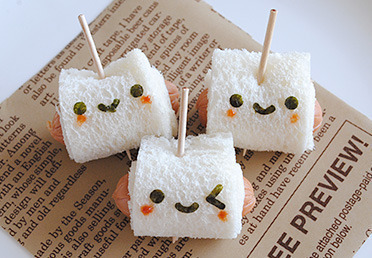 ウイニーの両端を切り、4等分にし、のりで作った目をつけ、2にスパゲッティでさす。