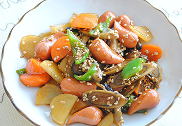 ウイニーと根菜のピリ辛炒め