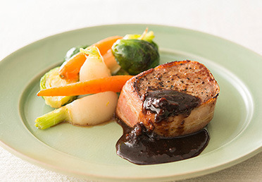 繊維に直角にカットしたお肉の外側に巻いたベーコンが、旨みをとじこめます。甘みのあるソースとの相性もバッチリです。