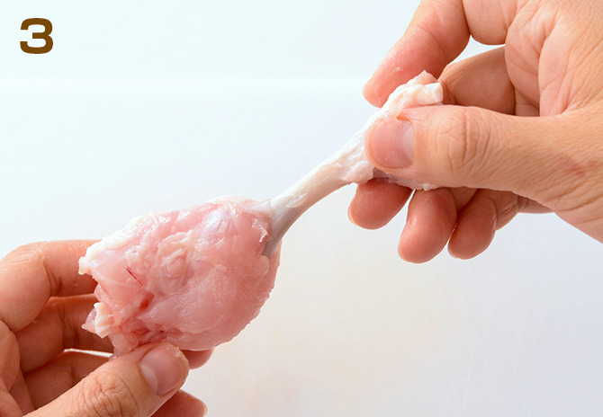 下ごしらえの時点で、チューリップ型になるように手羽元のお肉部分をめくりあげて、形を整えておくのがポイントです。手で持って食べるための骨を長く出しておくとよいでしょう。キッチンばさみを使うと作りやすいです。