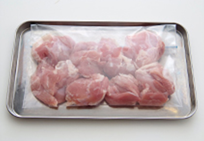 肉は平らにし、ひき肉は薄く伸ばすなどして表面積を大きくして密封し、アルミトレーに乗せて急速冷凍します。
