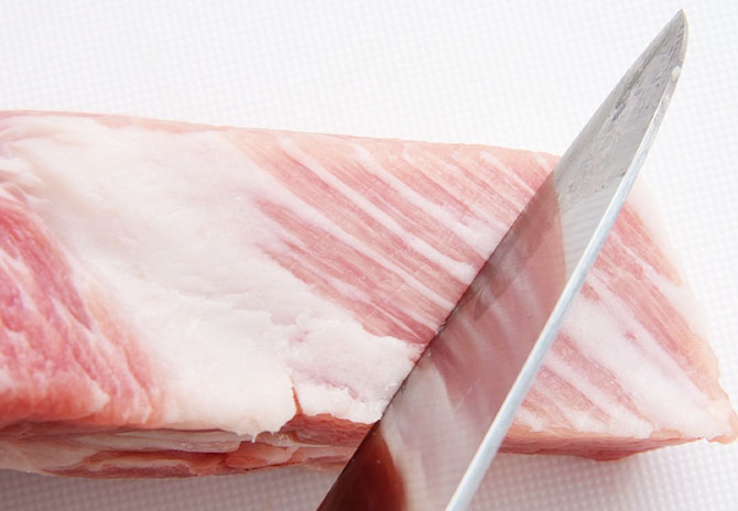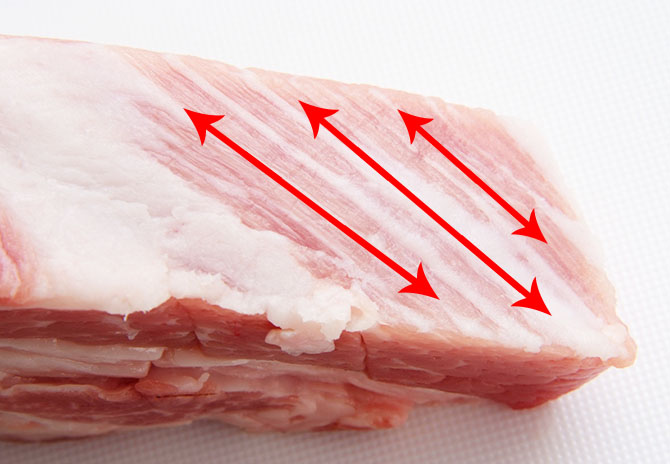 肉の繊維の方向を確認し、繊維が横になるように肉を置きます。