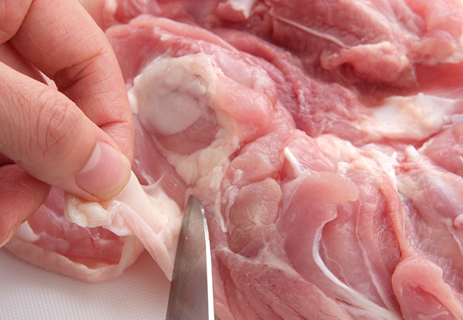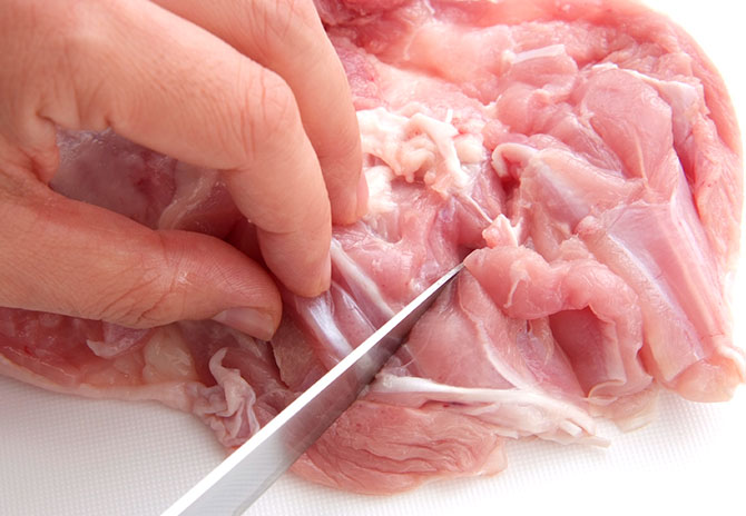 筋を切るときは、包丁を立てて刃先を使います。鶏の筋は全体にわたっているので、1cmくらいの切り込みを2-3cm間隔で全体に入れていきます。