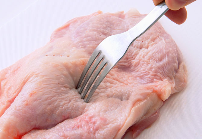 鶏肉の皮や筋は、熱が加わると縮みます。一口サイズにカットして使うときはいいのですが、一枚をそのまま焼くときは、あらかじめ皮に穴をあけて筋を切っておくことで、縮みを防ぐことができ味のしみ込みもよくなります。