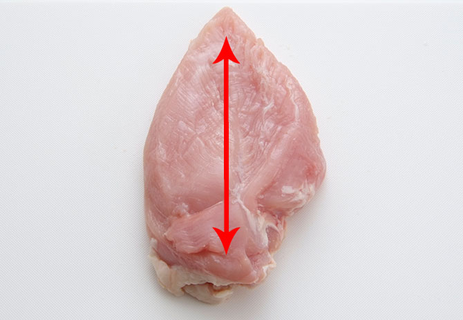 ムネ肉を縦に置いて厚みを見て、切込を入れる中央部分を確認します。