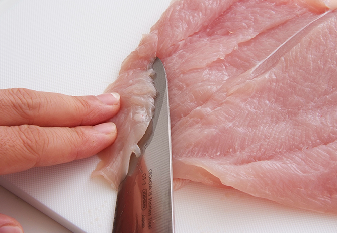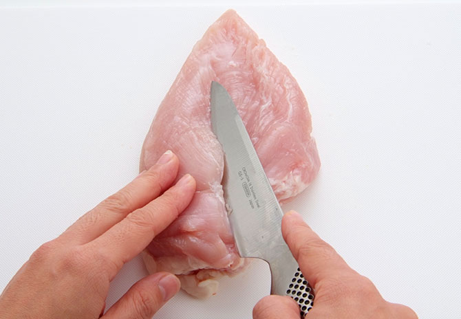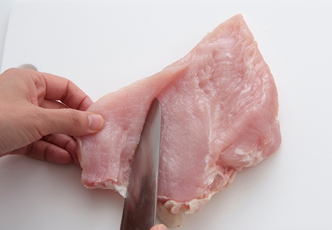 厚みのある鶏ムネ肉は、平らに開くことで巻き物に使うことができます。肉を中央から左右に開くことを「観音開き」と言います。また一口大にカットするときは、表面積を大きくして火を通りやすくするために「そぎ切り」にします。