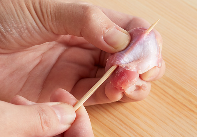 4.刺しこんだ竹串を手前に引き起こすようにして、銀皮をはがしやすくします。