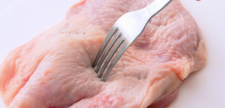 筋切り、皮に穴をあける(鶏モモ肉)