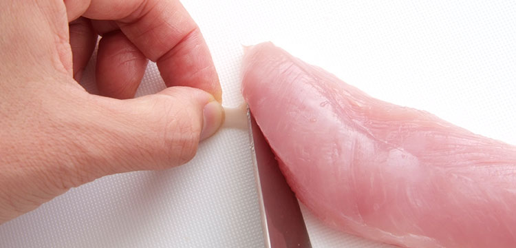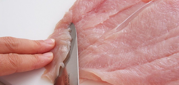 ささみ肉には白い筋があり、加熱したときに肉が縮む原因でもあります。また口に入れたときも残ってしまうので、筋は取り除いておきます。「筋なし」のささみを売っているお店もありますので、面倒な方はそちらを買うと良いでしょう。