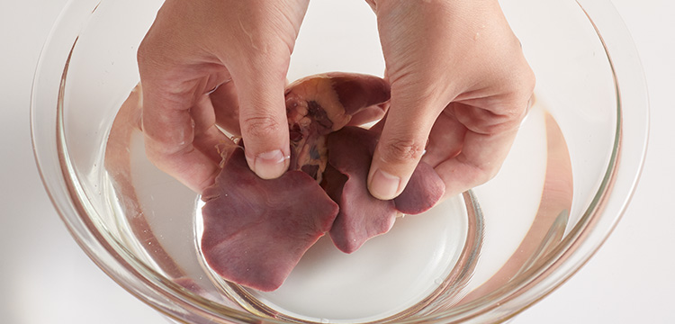 「ハツ(心臓)」と「レバー(肝臓)」を合わせて「肝」として売られていることが多いです。肝はハツとレバーに切り分けて、それぞれに下処理をします。ハツもレバーもよく水洗いをして血の部分を流し、処理したレバーは氷水につけておくと、くさみを抜くことができます。