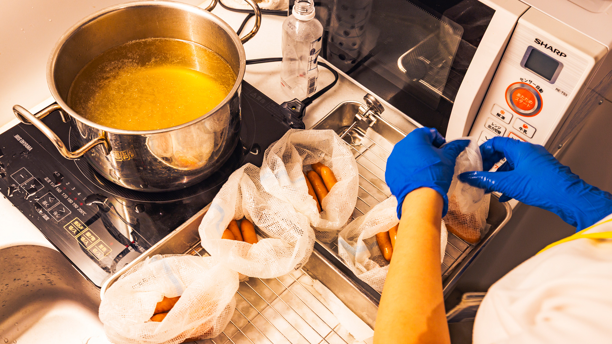 実験では5種類のウインナーが同じ条件になるよう、それぞれ袋に入れ分けて同時にボイル