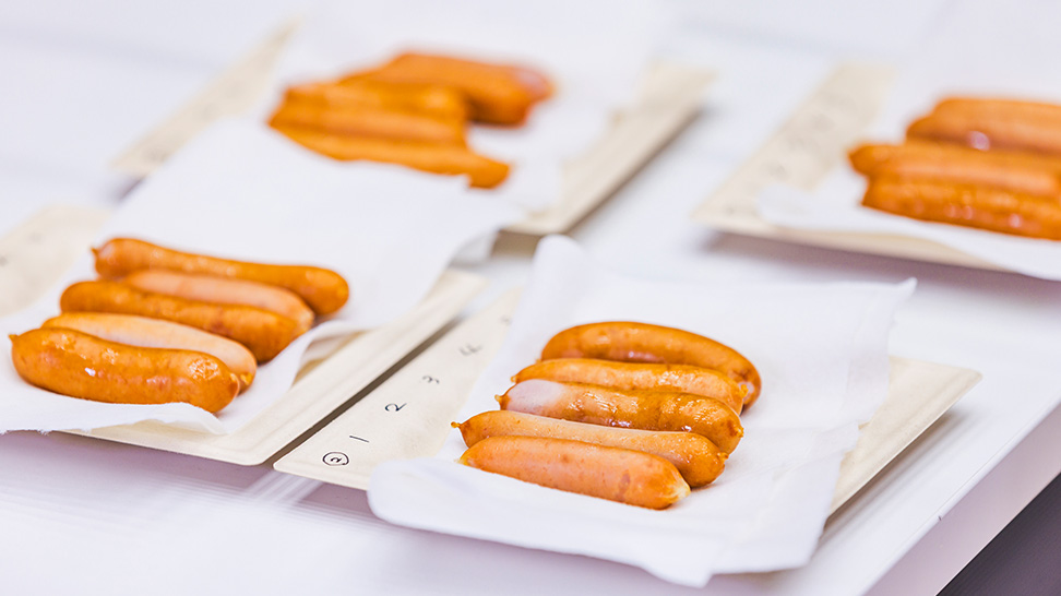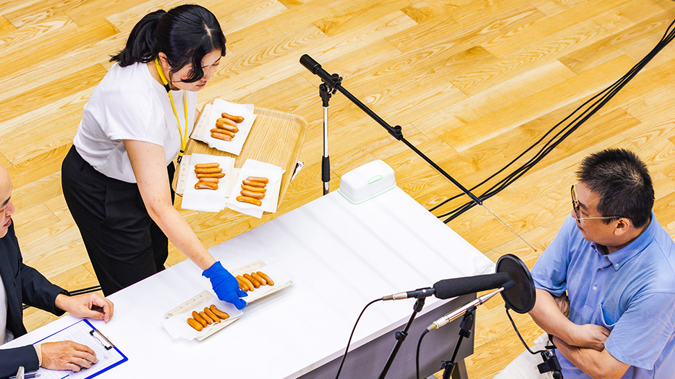 実験に協力いただいたのは10代から60代以上までの男女計16人。試食したのは、日本ハムの製品A~C(A:シャウエッセン、B:コラーゲンでできた人工皮のウインナー、C:羊腸を使ったウインナー)、シャウエッセンに近い価格帯の他社製品Dと他社製品Eの5種類です。