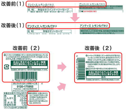 (1)裏面の商品名の文字サイズを大きくし(8pt→9ptへ)、太字にすることで判別しやすくなりました! また、(2)レイアウトも併せて変更することで裏面が見やすくなりました!