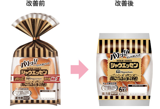 中身はそのまま、シャウエッセンの袋の上の部分をなくしました! これによりプラスチック使用量が28%カット※されました。 ※シャウエッセン巾着127g 2束と比較(フィルム重量比)