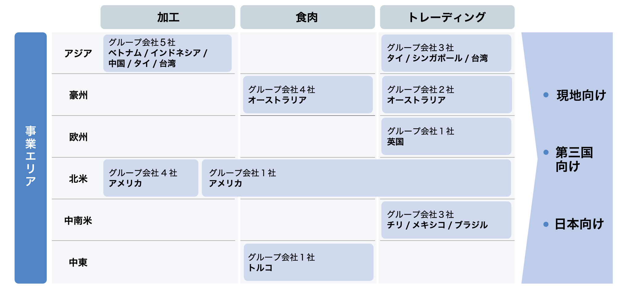 豪州、中東において、牛・鶏の生産・飼育、処理・加工の事業をはじめ、北米、アジア、欧州などにおいて、加工品の製造・販売、トレーディングの事業を推進しています。私たちの製品は、食の伝統や価値観、多様な嗜好、食へのニーズを理解・尊重し、現地、第三国、日本など世界各地にお届けしています。