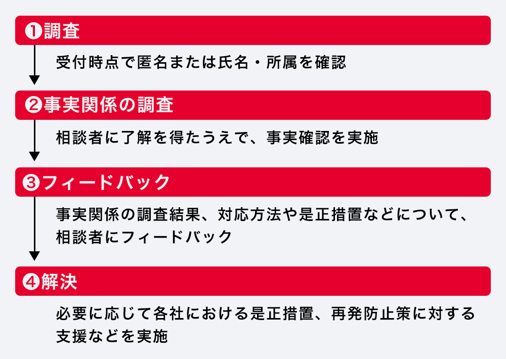 業務上不正・ハラスメント等コンプライアンス問題に関する報告・通報があった場合、内容に応じて調査します。コンプライアンス違反案件を特定し、懲戒処分相当であることが判明した場合は、社内規程等に沿って、適切に対応します。