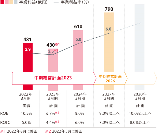 2022年3月期からスタートした「中期経営計画2023・2026」は、前中計での課題や外部環境の変化を踏まえ、6カ年を見据えた計画です。KPIマネジメントとDXをコアに既存事業の構造改革と強化を進め、ROICをもとに最適な事業ポートフォリオを追求します。事業戦略とマテリアリティを一体化させて取り組むことで、社会課題解決と当社グループの成長・発展を実現し、企業価値最大化を目指してまいります。