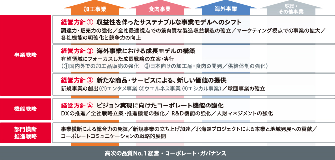 経営方針の2つ目、海外事業につきましては、海外食肉事業において豪州でグレインフェッドをはじめとしたプレミアムグラス等でブランド牛肉の販売強化を図るほか、ウルグアイでも付加価値の高い牛肉のブランディングを展開します。また、相場を的確に捉えた最適生産体制へと変革します。加工事業では北米での展開を拡大します。ロサンゼルスに本社があるデイリーフーズでは、主力商品である鶏肉加工品「マンダリンオレンジチキン」の生産能力拡大を図り、植物性たんぱくをベースとする商品開発を進めるとともにR&D部署を新設し、日本で培った加工品ノウハウを活用します。また、すでに発売しているグルテンフリーの米粉パンへの需要拡大にも対応します。