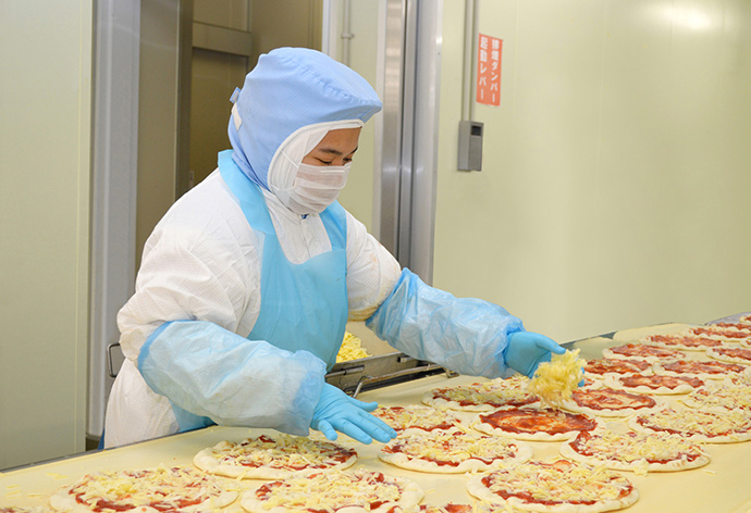 トマトソースと、カットしたてのチーズを丁寧に、そして衛生的に素早くトッピングします。