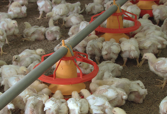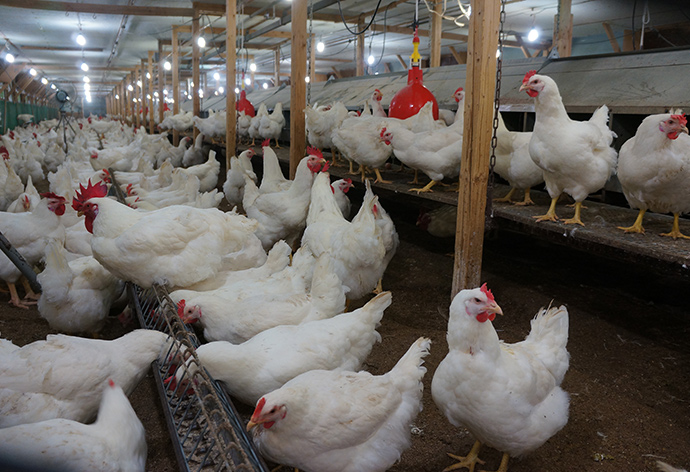 各農場では、徹底した防疫体制を整えています。また、衛生環境を保つために、ヒナを一斉に鶏舎に入れ、一斉に出荷する“オールイン・オールアウト方式”を採用し、出荷後は、鶏舎を徹底的に洗浄・消毒しています。