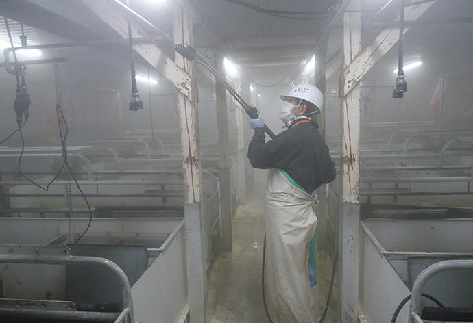 豚の健康・快適を保つため、豚舎内の空調制御はもちろん、農場内に病気を持ち込まないように、従業員、関係車両はシャワーを浴びてから入場します。豚舎においても、新たな豚を迎える際には、徹底的に部屋を水洗、消毒し、清潔さを保っています。