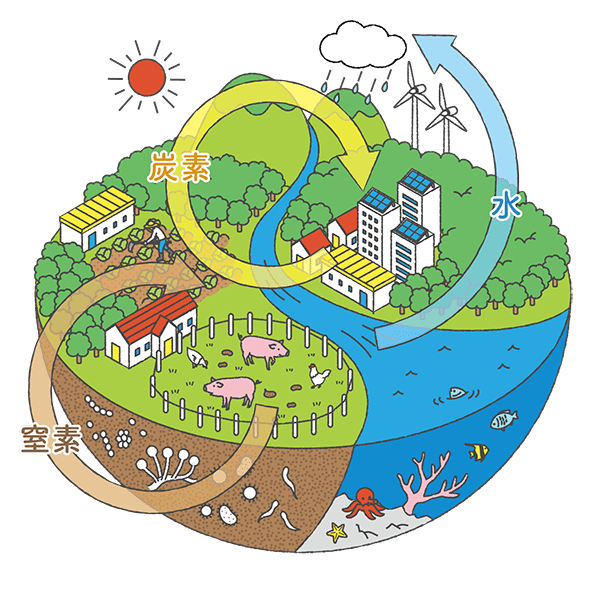 - 人と家畜をはじめ、地球上のあらゆる生命を形づくる炭素・水・窒素などの物質は、自然の営みによって再生され循環しています。しかし、人口増加や企業活動により、化石燃料や資源の使い過ぎが進み、地球の物質循環の限界を超えて、気候変動や大気、水の汚染などの環境課題を引き起こしています。