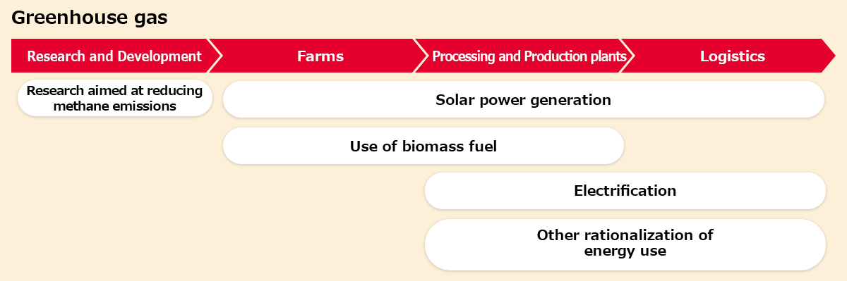 燃料転換や廃熱回収、高効率機器への更新、および機器の運転管理の見直しなどの取り組みを行っています。日本デイリーネット(株)では、積載効率や輸送ルートの見直しを行い、ニッポンハムグループ内の製造工場と各物流センターの輸送効率の向上に取り組んでいます。