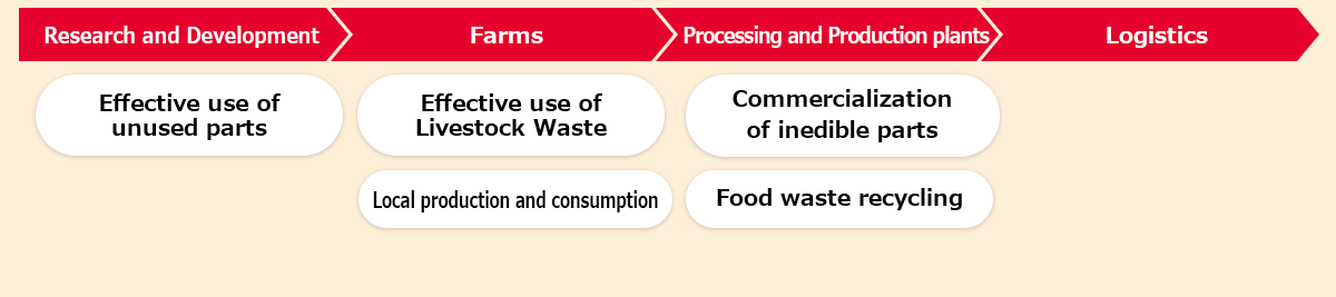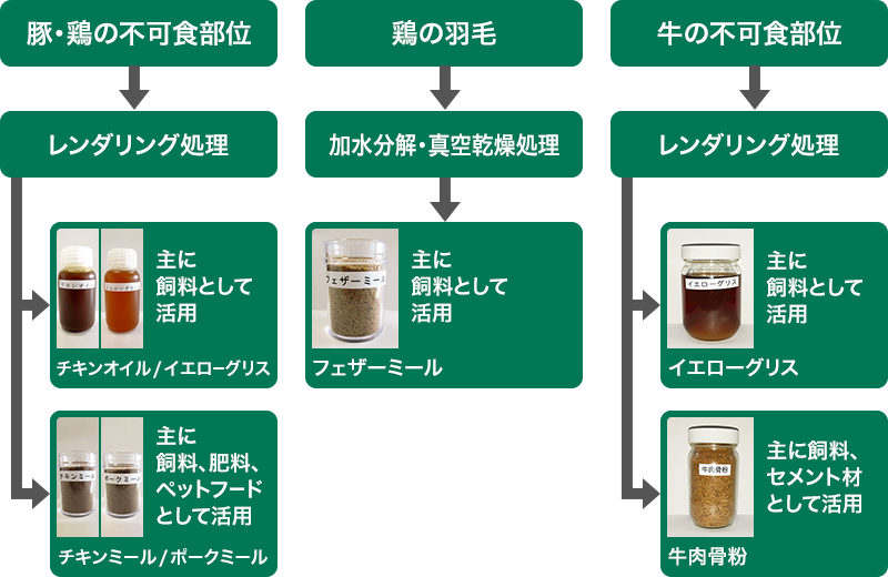 ニッポンハムグループは、豚、鶏、牛の処理工場で発生する食用とならない副産物(不可食部位)は、飼料、肥料、工業原料に加工し、有効活用しています。