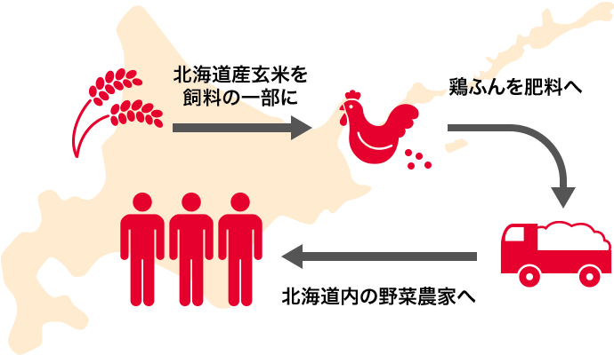 飼料の一部には北海道産の玄米を使用しており、その玄米を食べた鶏から出る鶏ふんは道内の農場に提供され、野菜作りに活用されています。