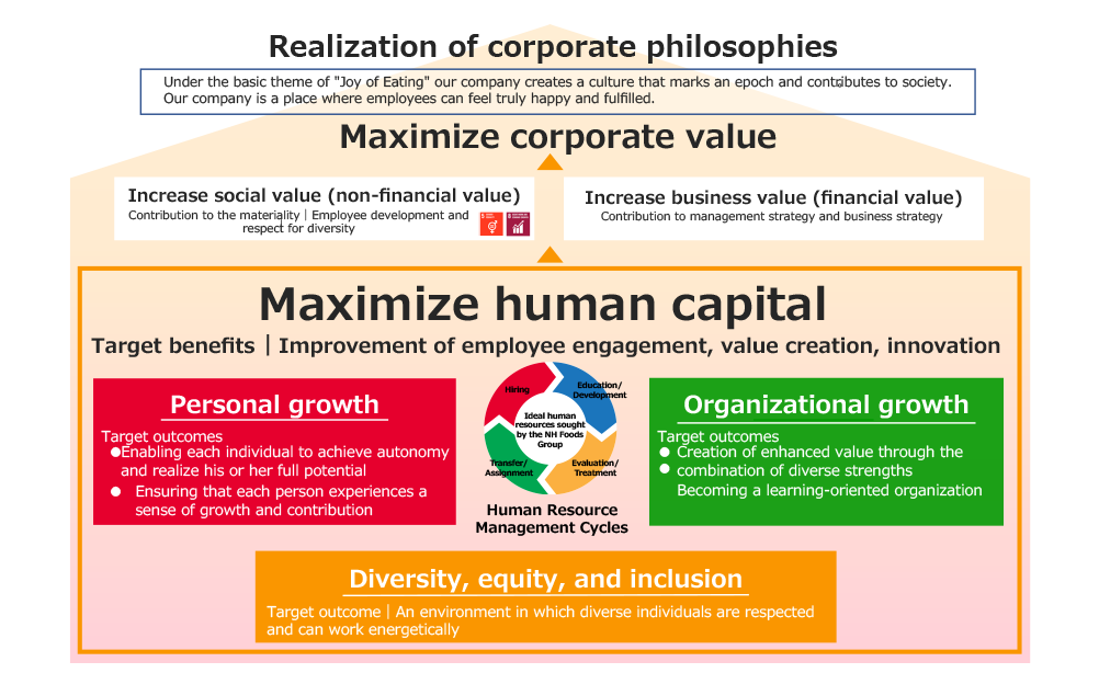 NH Foods Group aims to "maximize corporate value" by pursuing the "increase of social value (non-financial value)" and "increase of business value (financial value)" in order to realize our corporate philosophy. Under our human resources strategy, we will identify a path to linking the abilities of "individual employees" to "corporate value", and focus on fostering an organizational culture focused on new challenge of maximizing human resources. In order to achieve this, we have set "Personal growth," "Organizational growth," and "Diversity, Equity and Inclusion (DE&I)" as the three initiatives of our human resources policy.