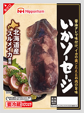 「いかソーセージ」はいかめしを参考に、“いか”と“ソーセージ”をコラボレーションさせた、新感覚のおつまみです。北海道産のスルメイカにあらびき肉を詰め、醤油タレで風味よく仕上げており、いかの歯ごたえとお肉の旨みが楽しめる商品です。ビールや日本酒などのお酒にぴったりです。