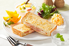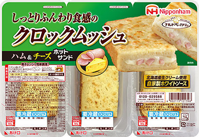 クロックムッシュとはトーストの1種でハムとチーズを挟んで表面を焼いたホットサンドイッチのことを言います。本商品はフレンチトーストの製法を取り入れ、しっとりとした食べやすい食感に仕上げました。北海道産生クリームを使った自家製ホワイトソースが食欲をそそります。| 商品名 | クロックムッシュ |