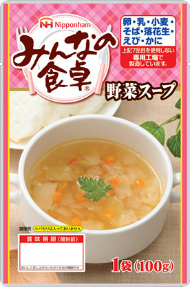 今回、食物アレルギー対応ブランド『みんなの食卓』シリーズより初めての「スープ」をラインアップします。たまねぎ・キャベツ・にんじんを使用したコンソメ味の野菜スープです。一番人気の米粉パンシリーズと一緒にスープを組み合わせると、洋風メニューをお楽しみいただけます。本品は常温保存可能なレトルトパウチタイプです。電子レンジ調理もしくはボイル調理で簡単に召し上がりいただけます。