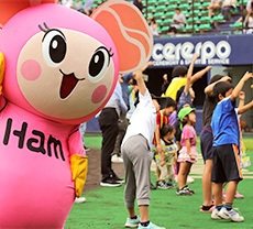 ニッポンハムのマスコットキャラクター「ハミュ―」と一緒にハムリンズ体操を踊って体を動かしましょう。